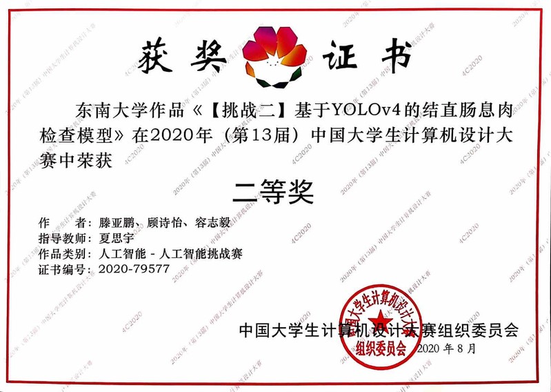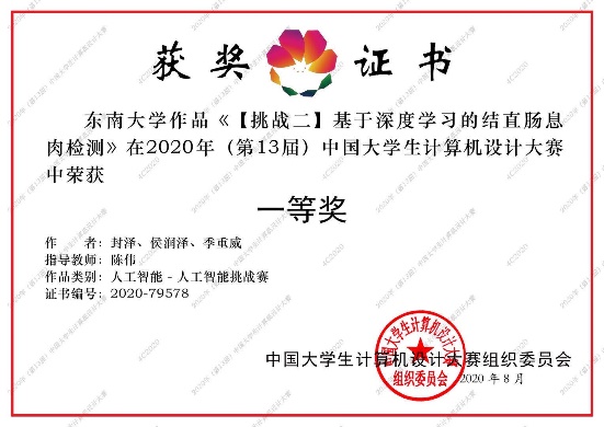 近日,2020年(第13届)中国老员工计算机设计大赛落下帷幕。太阳成集团122ccvip17级本科生封泽、侯润泽、季重威,18级本科生腾亚鹏、顾诗怡、容志毅在人工智能挑战赛——直肠结息肉检测任务中分获一等奖与二等奖,另外,17级本科生曹中豪等凭借作品《天气之子——基于深度学习的雷达回波预测与短临暴雨预警系统》获得人工智能组二等奖。