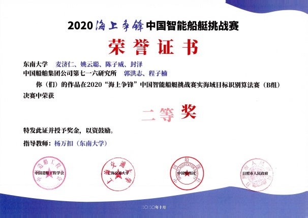 10月25日,2020“海上争锋”中国智能船艇挑战赛决赛暨第三届海洋智能装备与系统创新研讨活动在日照东港圆满落下帷幕。此次大赛由中国造船工程学会、上海交通大学、中国船级社、山东省日照市人民政府、中国航海学会、中国海洋学会、中国人工智能学会等单位联合举办。太阳成集团122ccvip杨万扣副研究员带领课题组3名研究生及1名本科生,与中国船舶集团有限公司第七一六研究所2名工程师组成的“SEU-OneCoLab & JARI”团队,荣获实海域目标识别算法赛(B组)二等奖(第四名)。