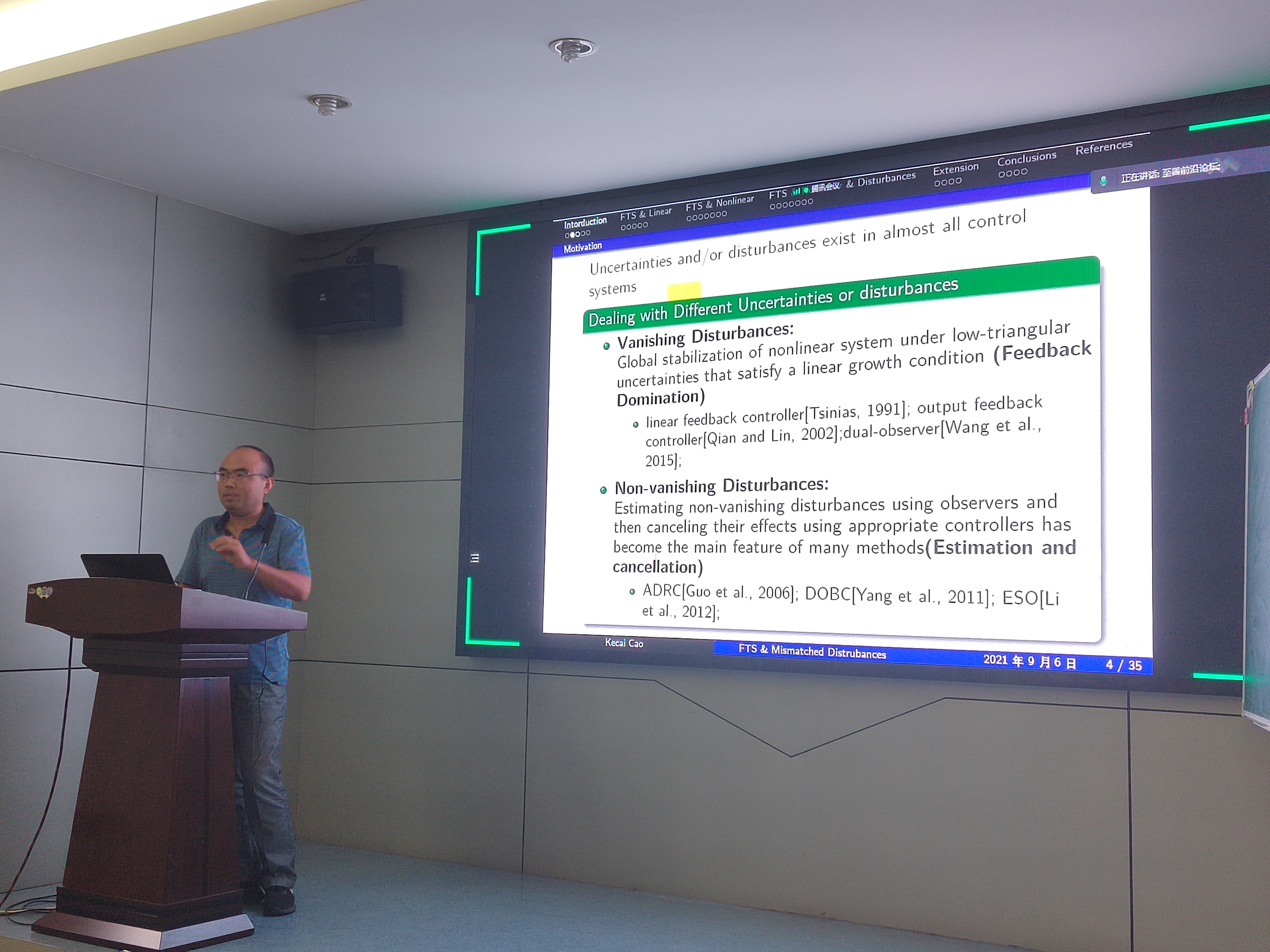 接下来作报告的是南京工程公司曹科才教授,报告的题目是“Finite-time Integral Controllers for a Class of Planar Nonlinear Systems with Mismatched Disturbances”,报告介绍了一类含有不匹配扰动的非线性系统的全局有限时间镇定问题的研究。该研究首先构造非线性积分动态对扰动进行补偿,对于有限时间收敛问题,利用系统状态巧妙地构造了新的控制器,仿真研究表明该控制器具有良好的控制性能。