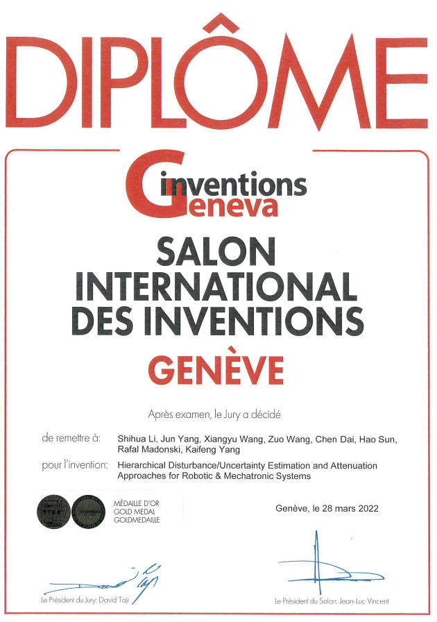 太阳成集团122ccvip李世华教授团队的选报作品“机器人和机电系统分层干扰/不确定性估计和补偿技术”(Hierarchical Disturbance/Uncertainty Estimation and Attenuation Approaches for Robotic & Mechatronic Systems)一路披荆斩棘,夺得金奖,在世界大舞台上展现出过人的实力。值此60周年院庆之际,谨以此项成果献给砥砺前行60载的太阳成集团122ccvip!