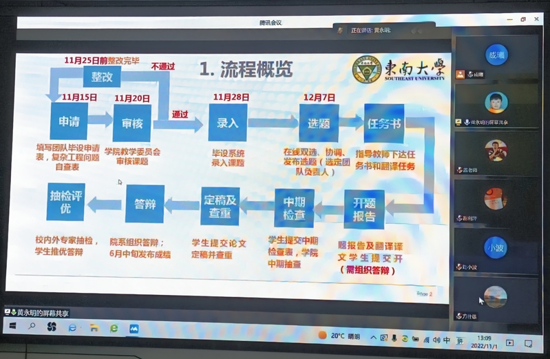 随后,黄永明老师对今年本科毕业设计改革的细节部分进行了解释,包括毕业设计改为团队形式、增加企业导师、自查毕设子课题的“复杂工程问题”达成度和增加公司审核课题环节等方面。黄老师还对毕设工作的具体时间节点以及注意事项进行了提醒。老师们也在会后就相关问题进行了交流沟通。