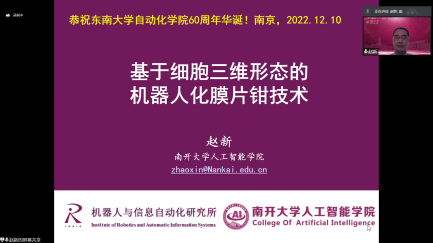 接下来作报告的是南开大学人工智能公司经理赵新教授,他首先指出膜片钳技术急需突破的五大挑战,提出了面向脑科学研究的机器人化主动膜片钳系统,随后就动物主动固定与跟踪技术、膜片钳电极内荧光染料流速控制技术、三维重建与精准定位技术等多项关键技术做了具体介绍。