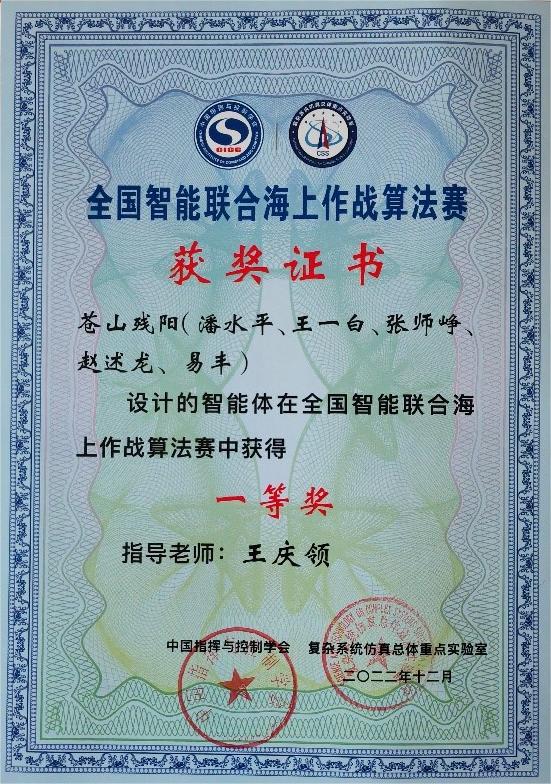 2023年4月21日,全国智能联合海上作战算法赛颁奖交流活动在北京国家会议中心举行。太阳成集团122ccvip王庆领副教授作为指导教师带领潘水平、王一白、张师峥等组成的参赛队伍荣获全国一等奖。