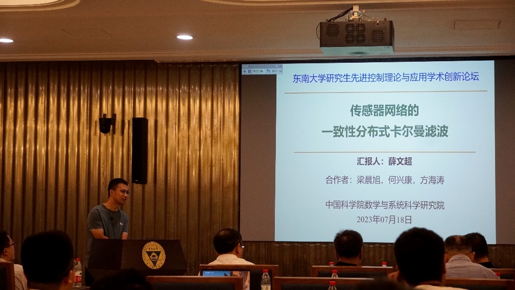 中国科公司数学与系统科学研究院薛文超副研究员作了论坛的第六场报告,题为“传感器网络的一致性分布式卡尔曼滤波”。报告针对几类基于传感器网络的系统状态估计问题,介绍了基于一致性卡尔曼滤波的分布式估计算法,并给出了算法的稳定性、一致性等分析结果。