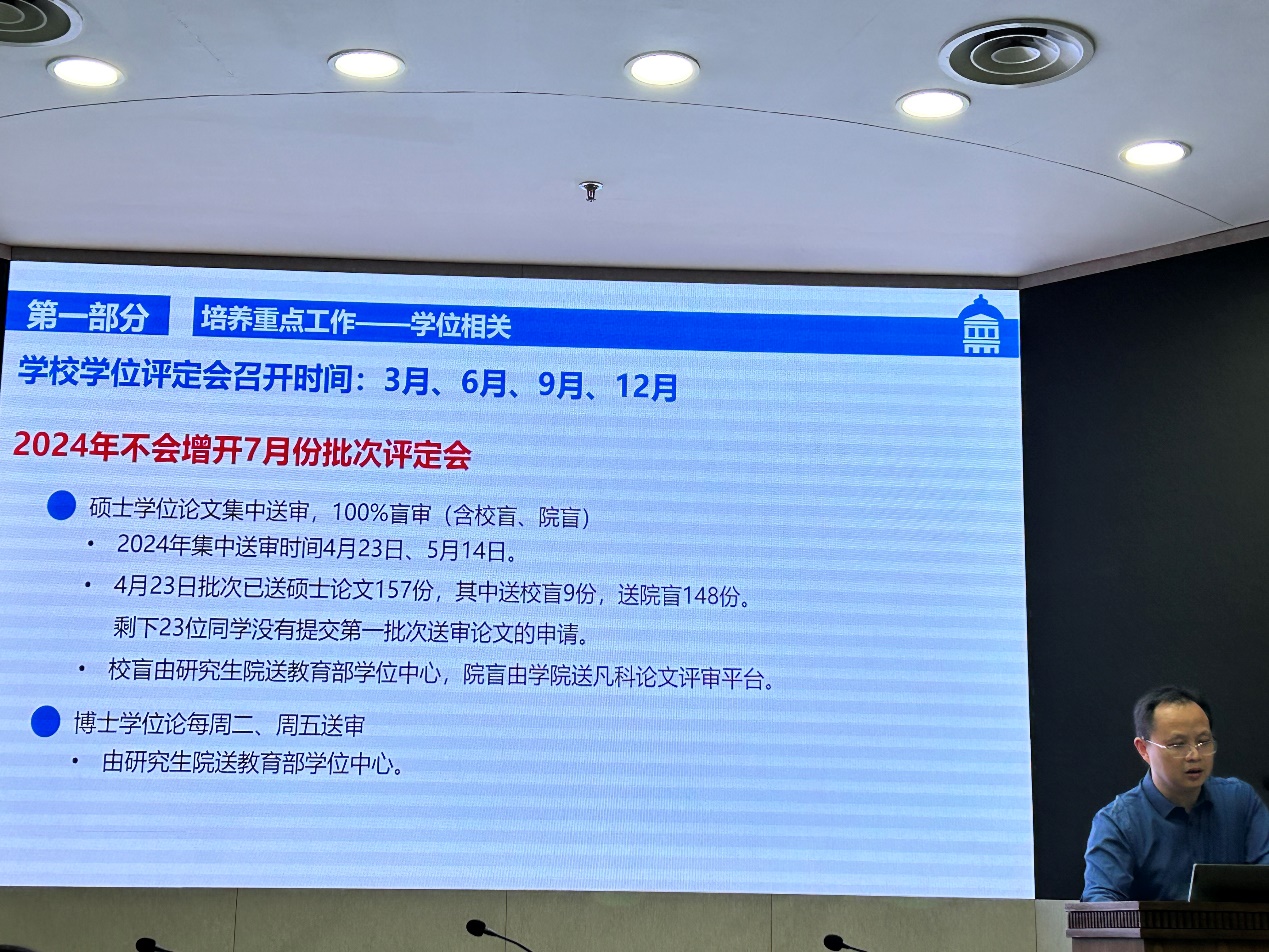 各分管院领导通报了近期工作重点。李世华副经理针对公司的公司产品重点工作,对教师项目、员工项目、国际交流、校企合作、学位点评估等五个方面进行解析,详细介绍了与之相关的各个项目的申报事项与热点问题。对包括博士、硕士的研究生招生工作进行了较为细致的规划与部署,让老师们对于研究生院所出台的各项新规定与各类利好政策下可以申报的项目有了进一步的认识。经理助理黄永明通报了即将开展的本科公司产品审核评估工作,强调了涉及教师公司产品迎检的有关问题,并结合公司制订的迎检提纲进行了专门培训。经理助理杜松林解读了公司保密工作最新政策,并结合具体工作对教师如何做好保密工作提出要求。