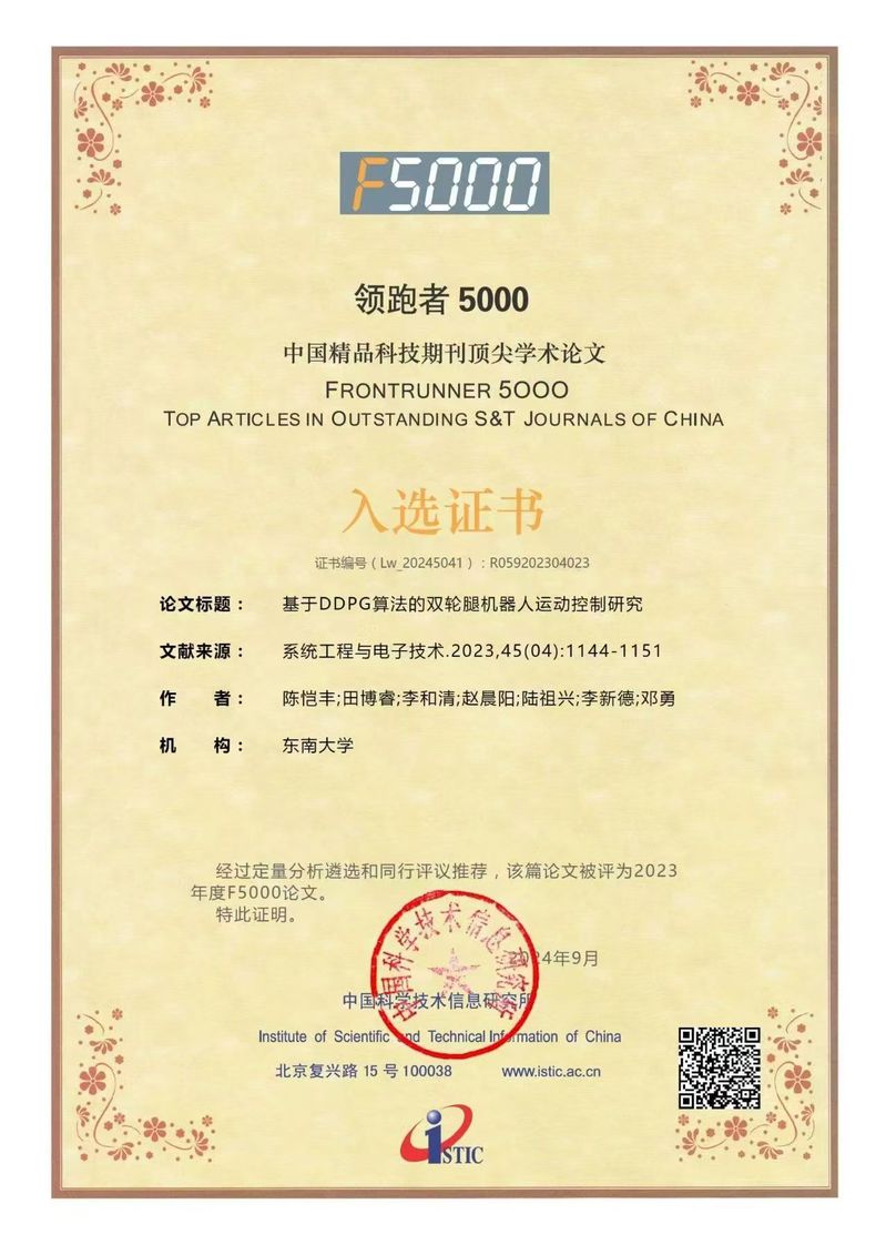 近日,国家科学技术部中国科学技术信息研究所(“中信所”)发布了2023年度“领跑者5000——中国精品科技期刊顶尖学术论文”(简称“F5000”)名单。公司李新德老师指导的本科生论文成功入选2023年度F5000论文。