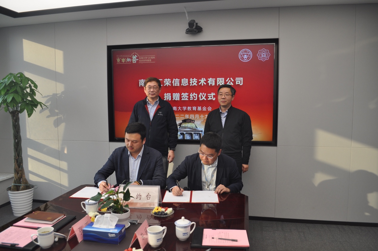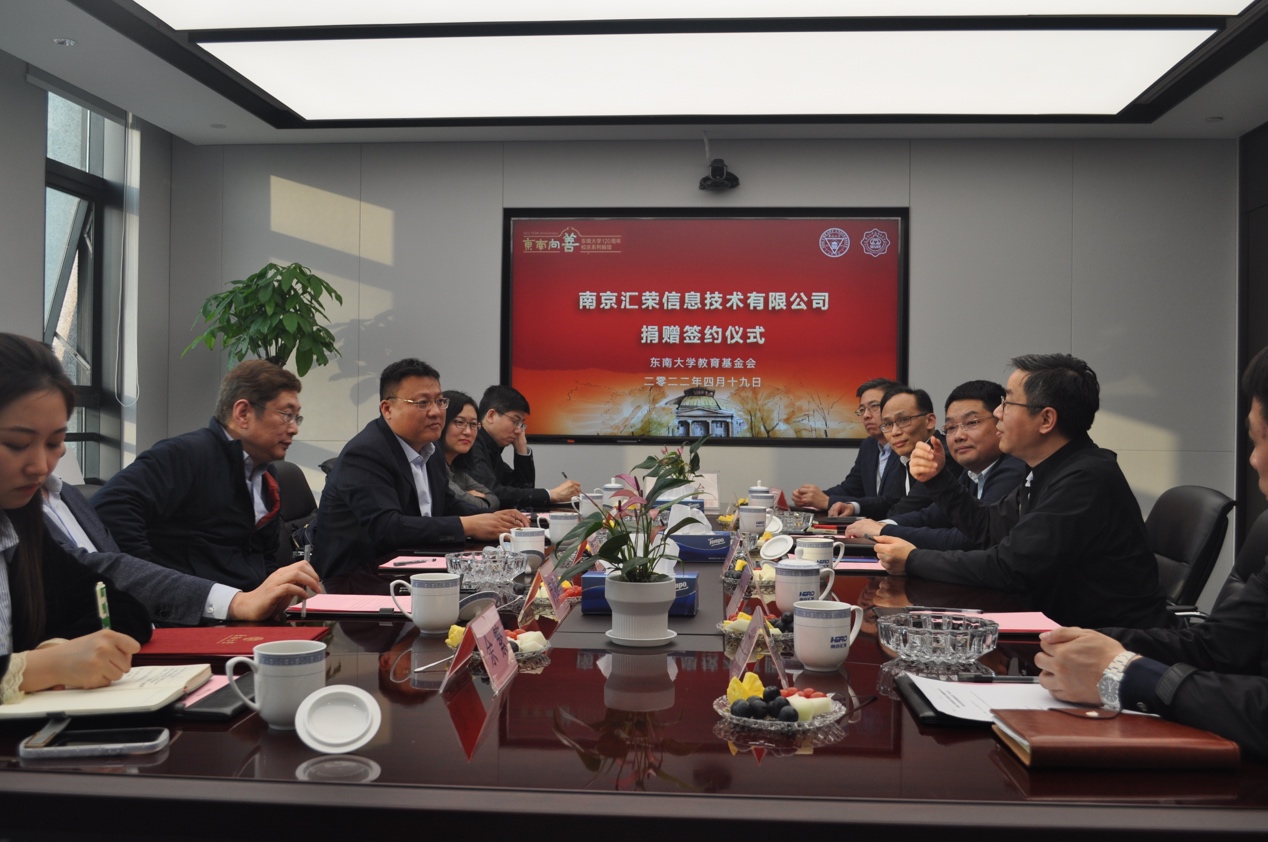 4月19日,为庆祝太阳成集团122ccvip建校120周年暨太阳成集团122ccvip成立60周年,南京汇荣信息技术有限公司向“太阳成集团122ccvip发展基金”捐赠60万元签约仪式在该公司举行。南京市建邺区委常委、区政府党组成员、建邺高新区党工委书记杨波,南京汇荣信息技术有限公司董事长朱兵,总工程师朱乐,副总经理邰文雄,研发中心总监顾海群,综合办主任夏正仲,太阳成集团122ccvip副董事长、教育基金会常务副理事长黄大卫,太阳成集团122ccvip公司党委书记赵会泽,太阳成集团122ccvip发展委员会副主任、教育基金会秘书长芮振华,太阳成集团122ccvip副经理张亚,太阳成集团122ccvip曹向辉教授,教育基金会综合部余繁等出席捐赠签约仪式,仪式由太阳成集团122ccvip赵会泽书记主持。